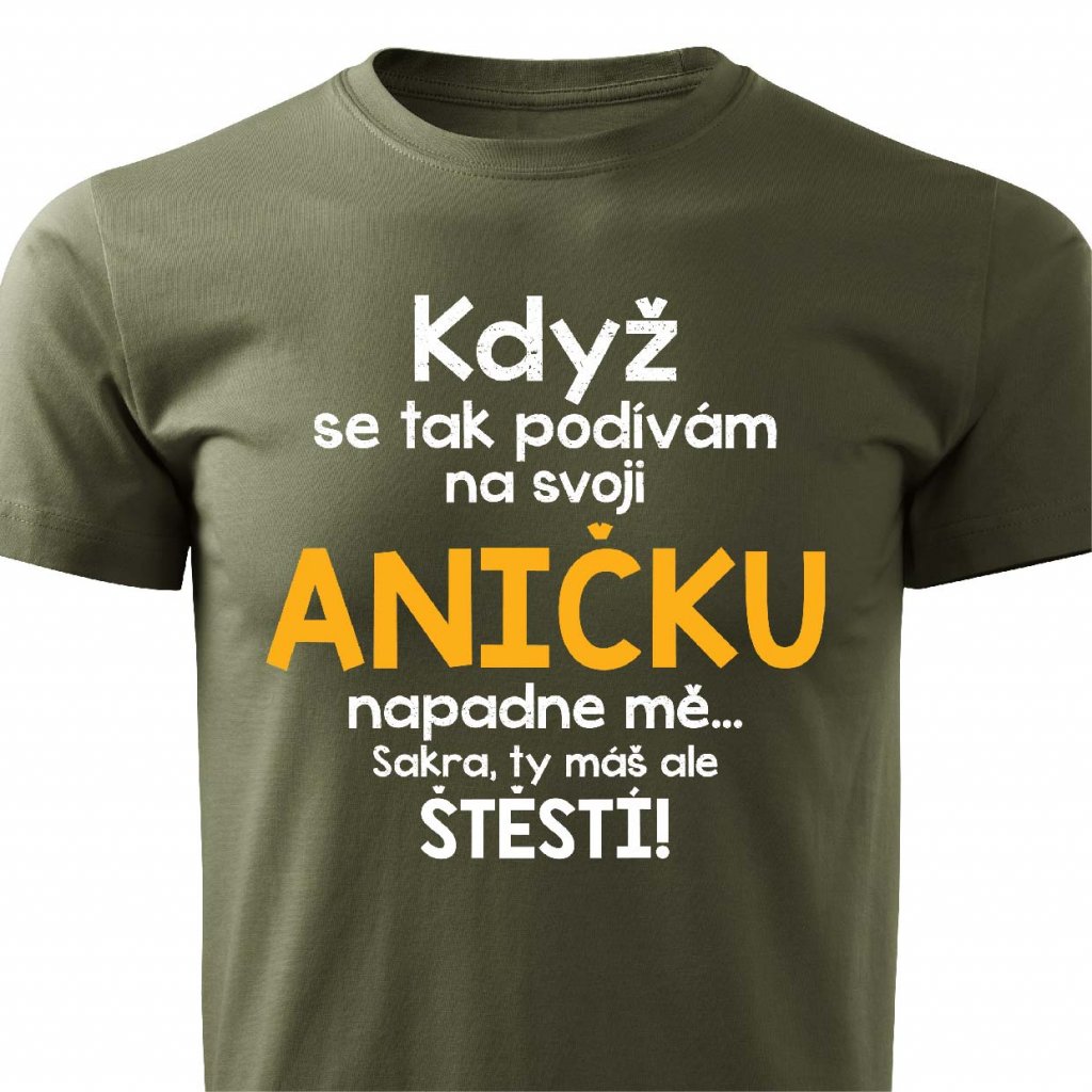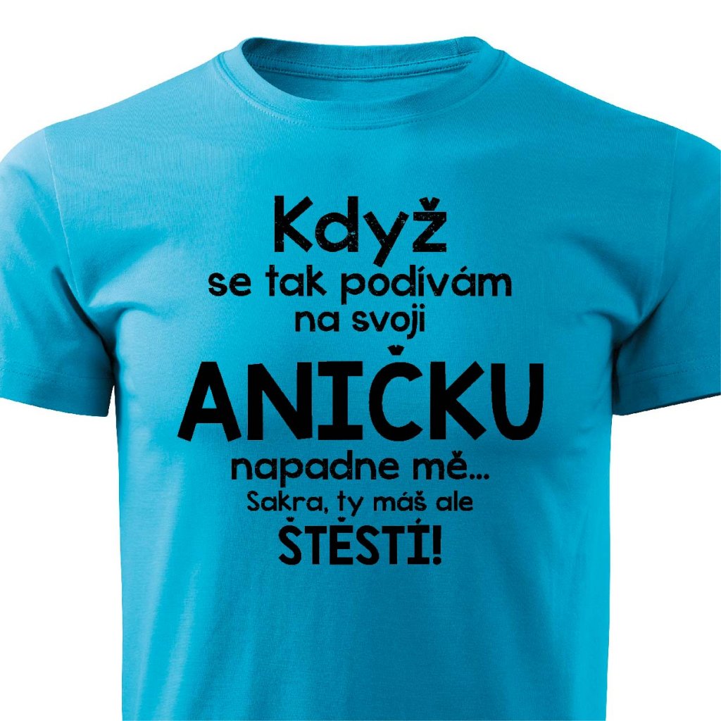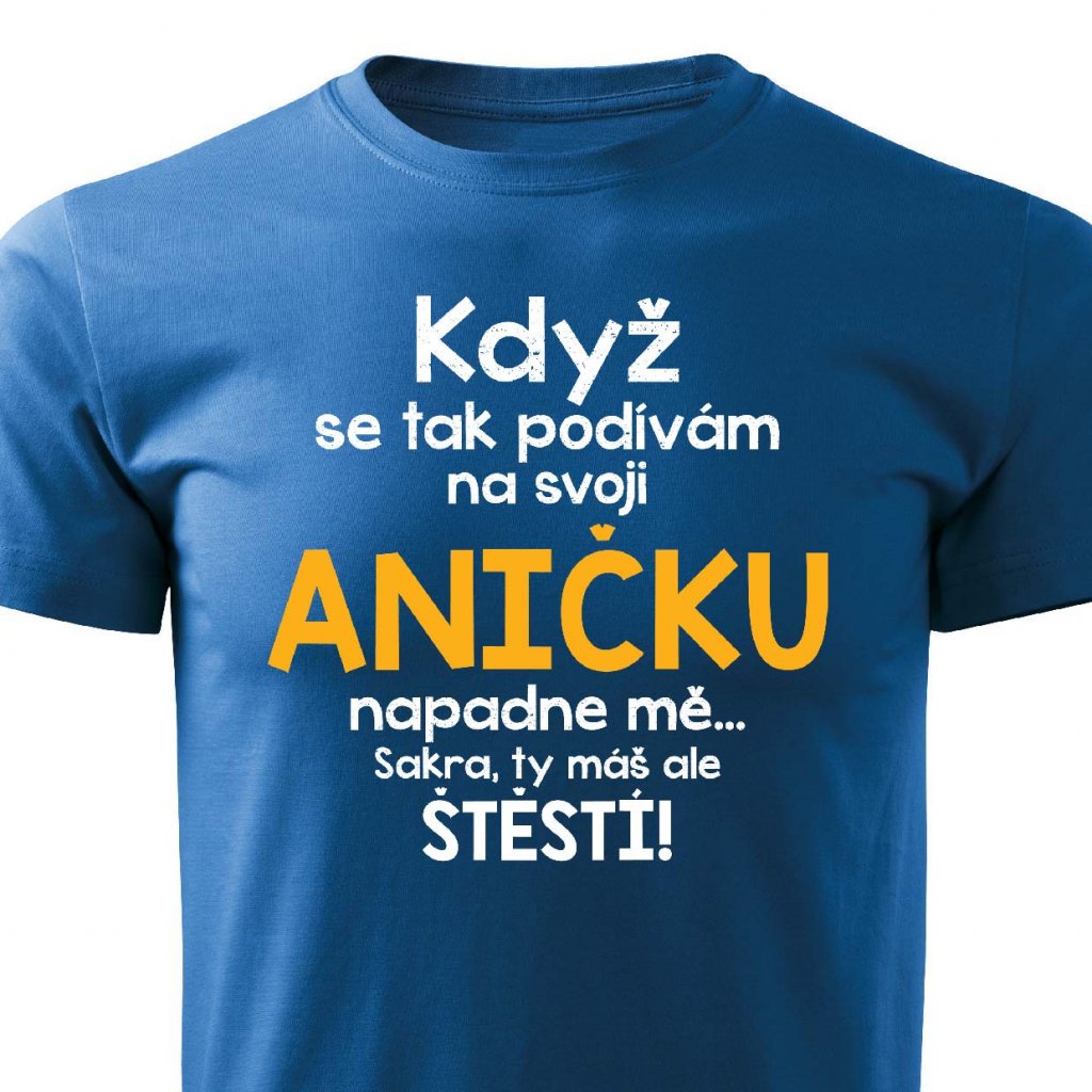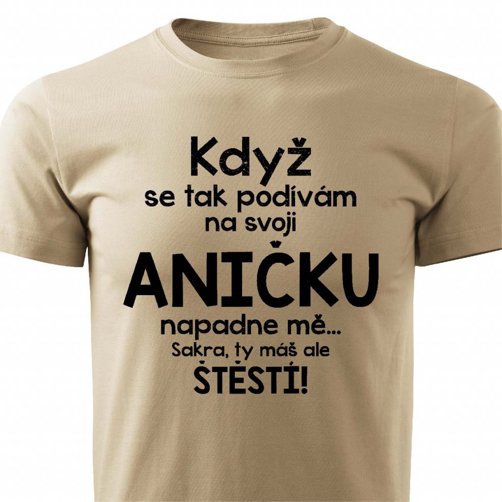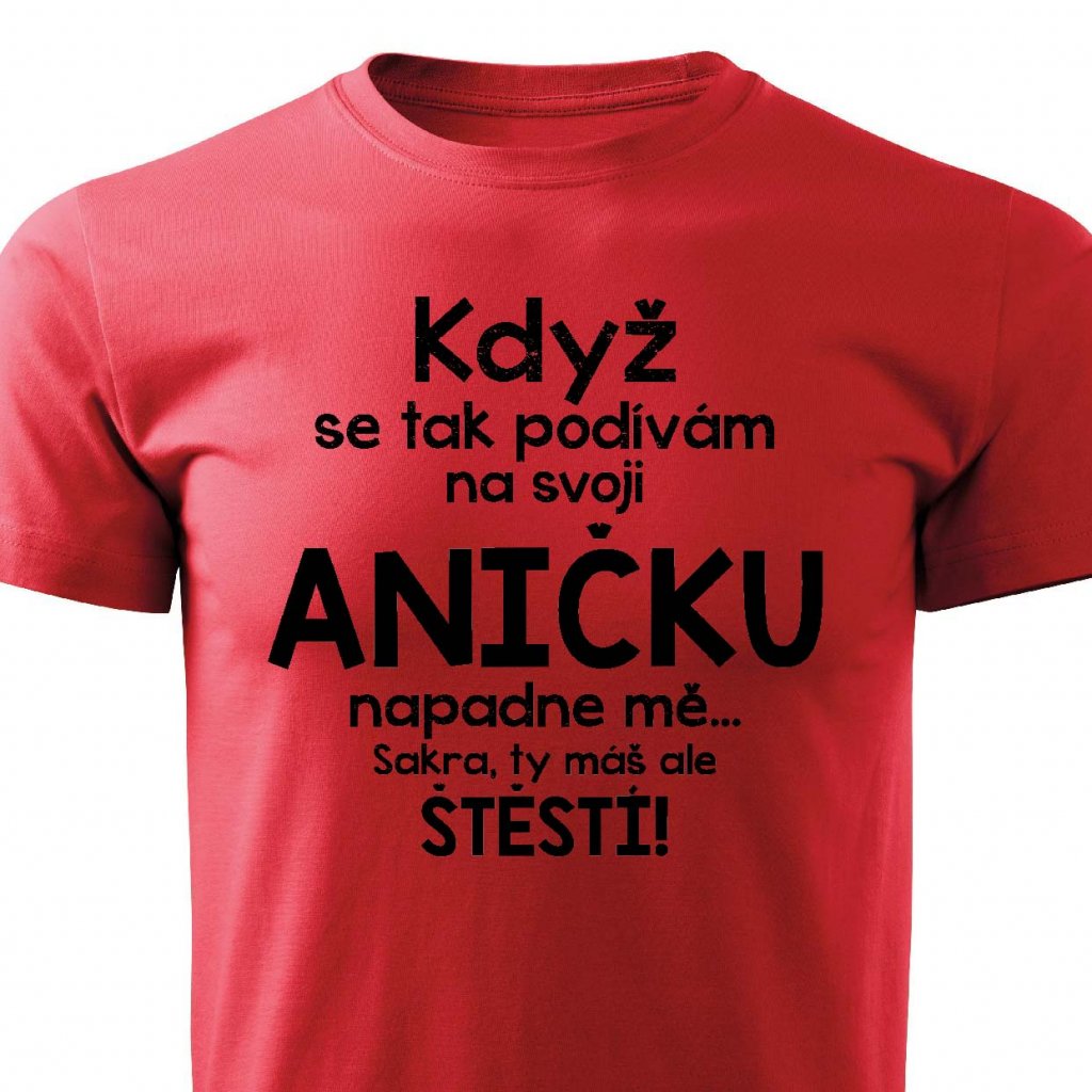 Tričko s potiskem Když se tak podívám na svoji Aničku, napadne mě, sakra, ty máš ale štěstí!