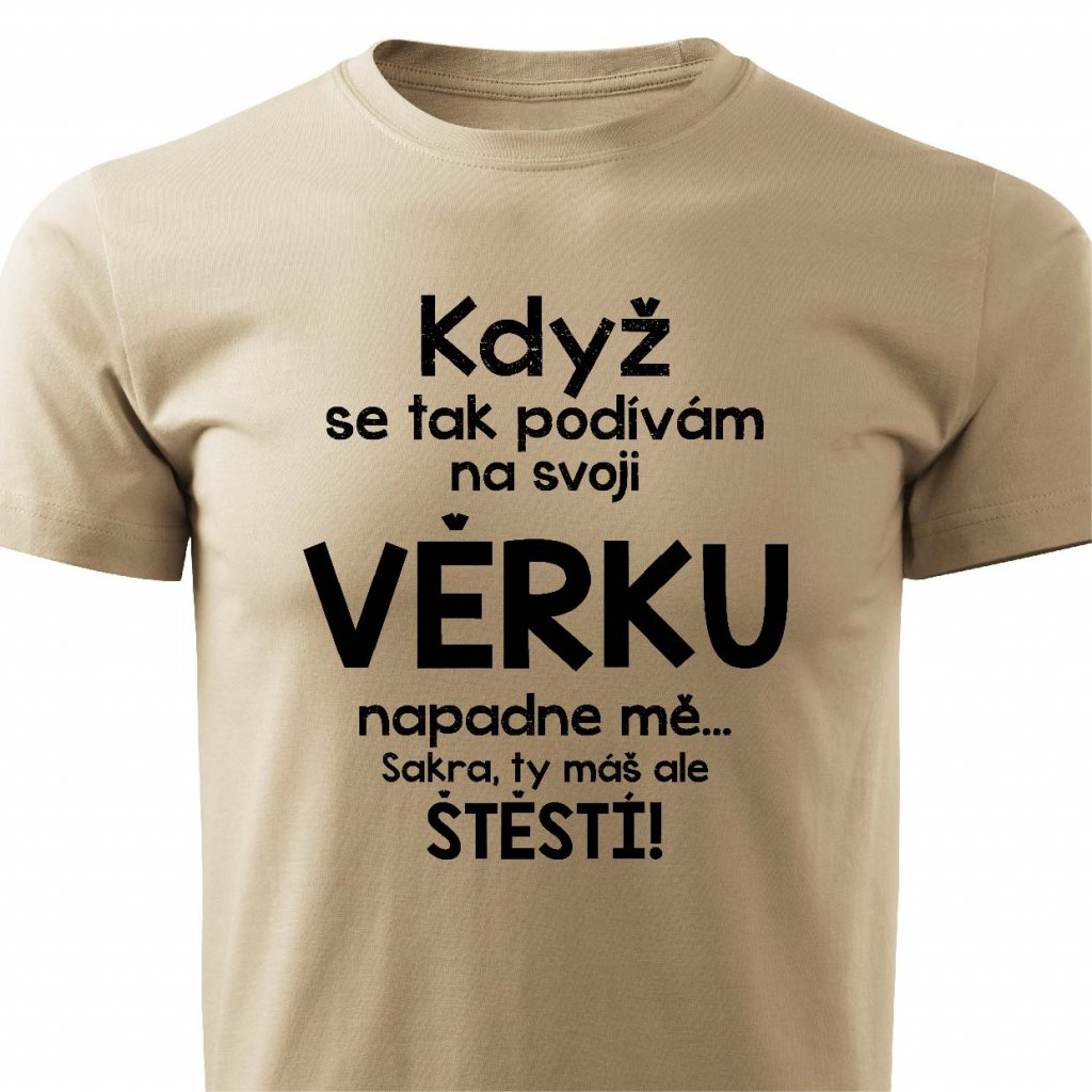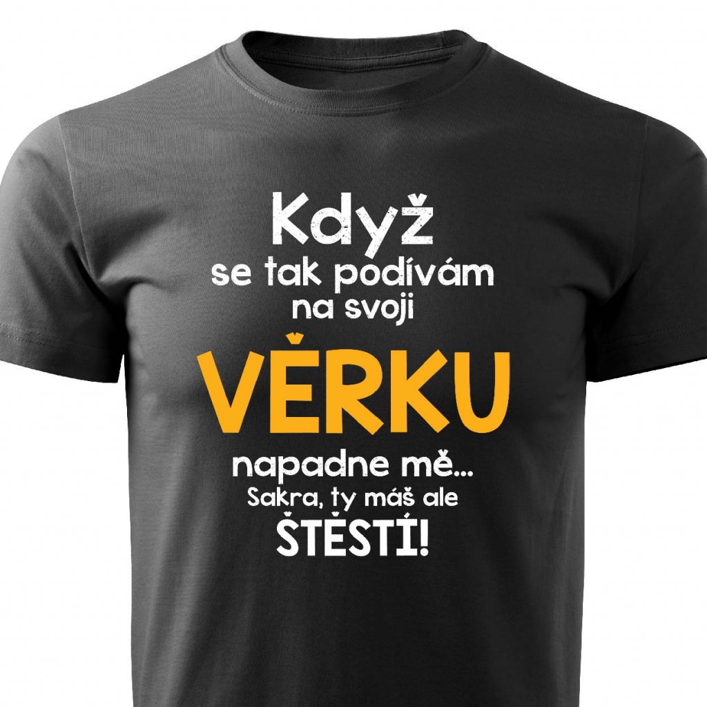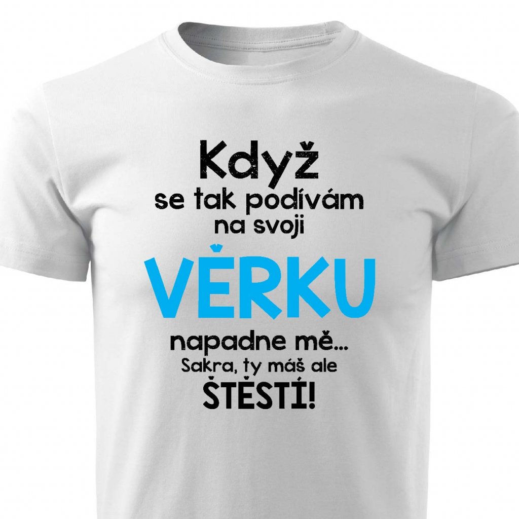 Tričko s potiskem Když se tak podívám na svoji Věrku, napadne mě, sakra, ty máš ale štěstí!