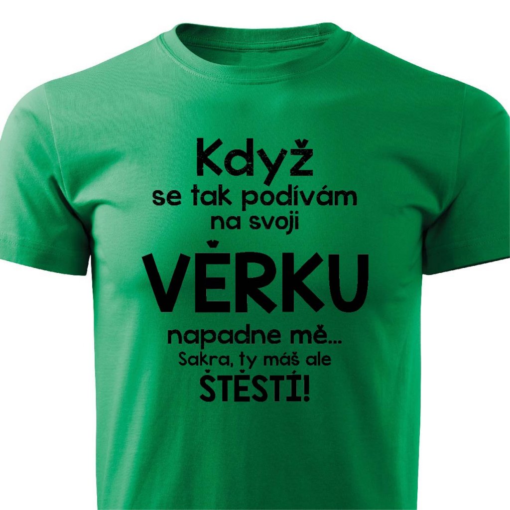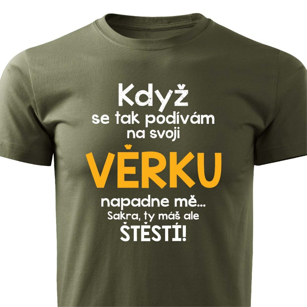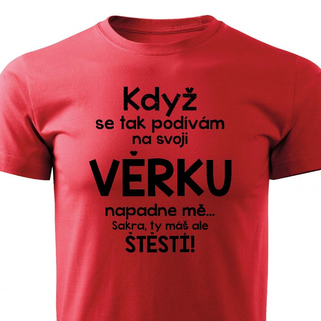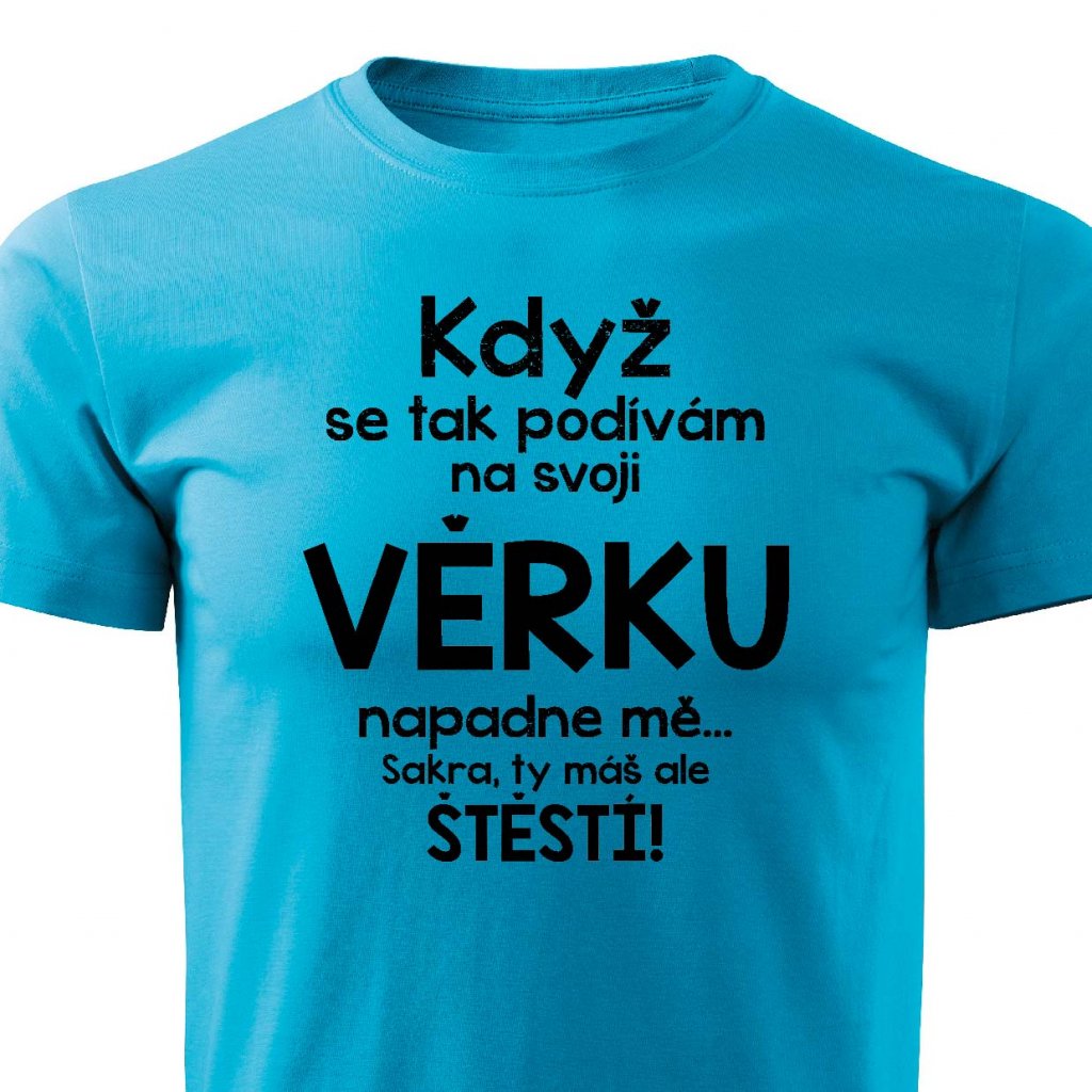 Tričko s potiskem Když se tak podívám na svoji Věrku, napadne mě, sakra, ty máš ale štěstí!