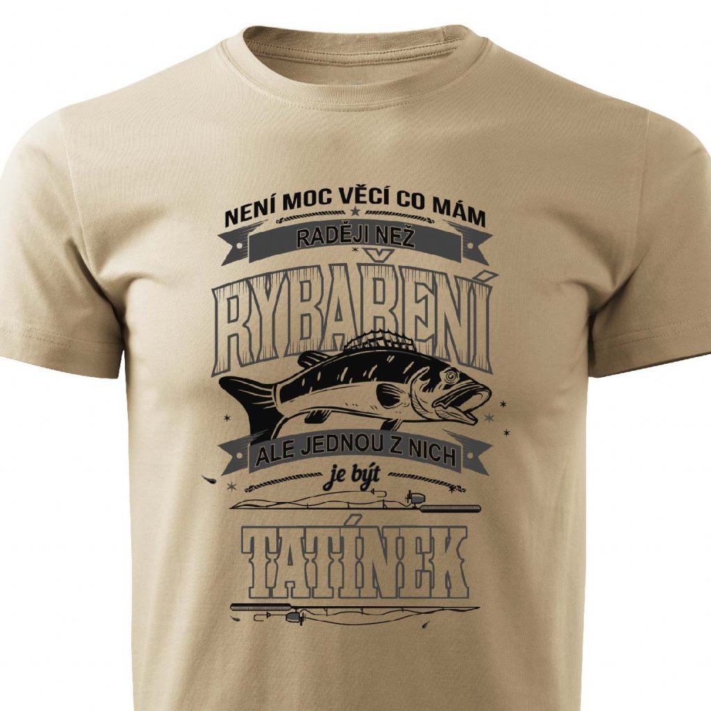 Ukažte svému tatínkovi rybáři tímto tričkem, že na něj myslíte. Skvělý dárek pro všechny, kdo milují rybolov i své děti. Ideální dárek k svátku, narozeninám nebo pro jinou příležitost. Tričko se stylovým nápisem je vyrobeno z kvalitního materiálu. Potisk je odolný, dlouhotrvající. Nepraská a neloupe se, lze jej často prát. Pořídit tento model můžete v různých velikostech a barvách, přizpůsobíte jej tak svému požadavku.