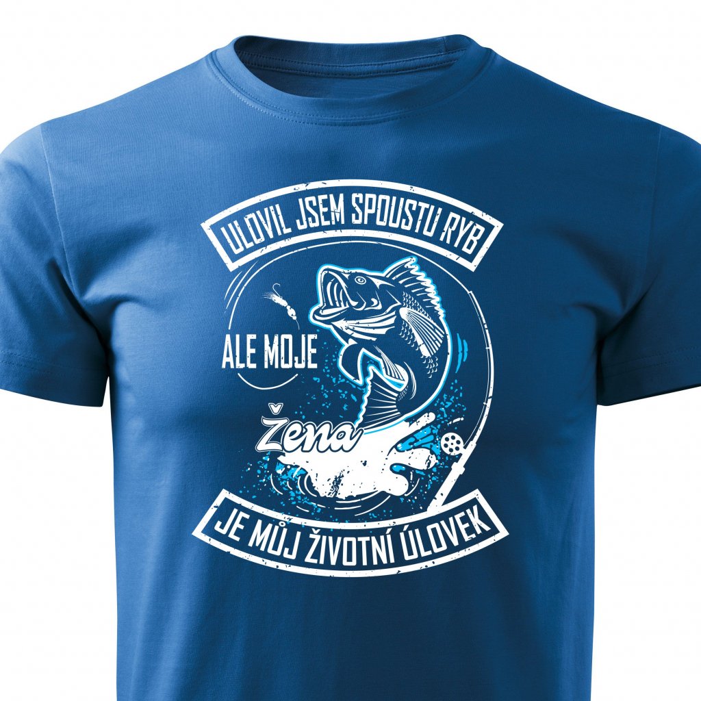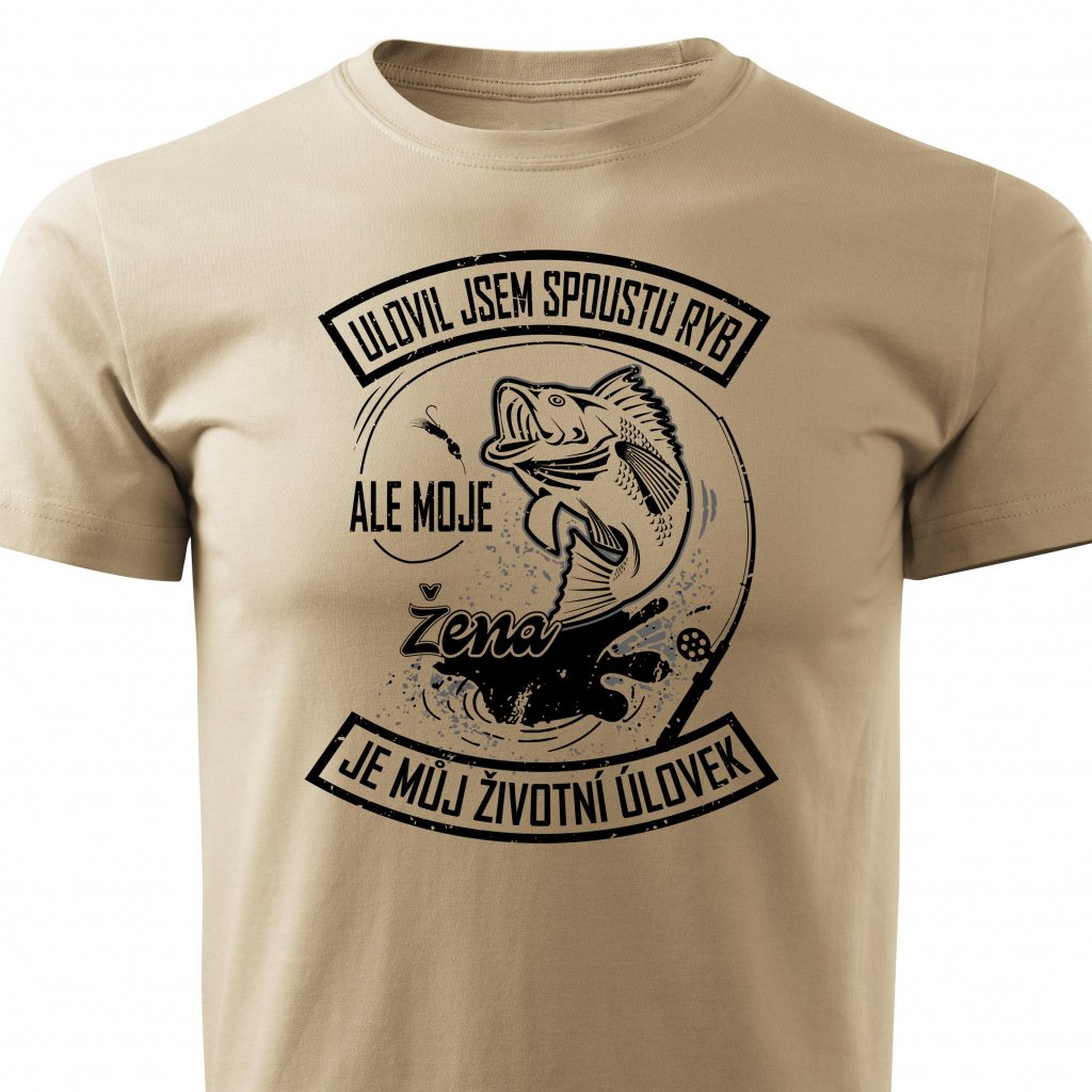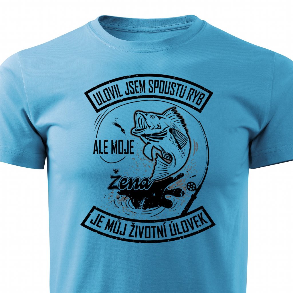 Tričko s potiskem Ulovil jsem spoustu ryb ale moje žena je můj životní úlovek.